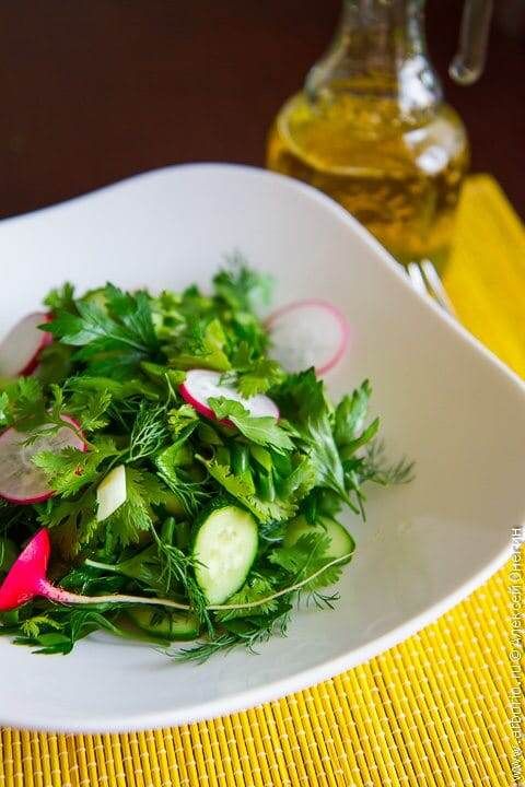 Ингредиенты на 2 порции: большой пучок зелени, 2–3 огурца, 3–4 редиски, 4 ст. л. масла (оливкового или подсолнечного), сок половины лимона, щепотка чёрного перца и соль.
