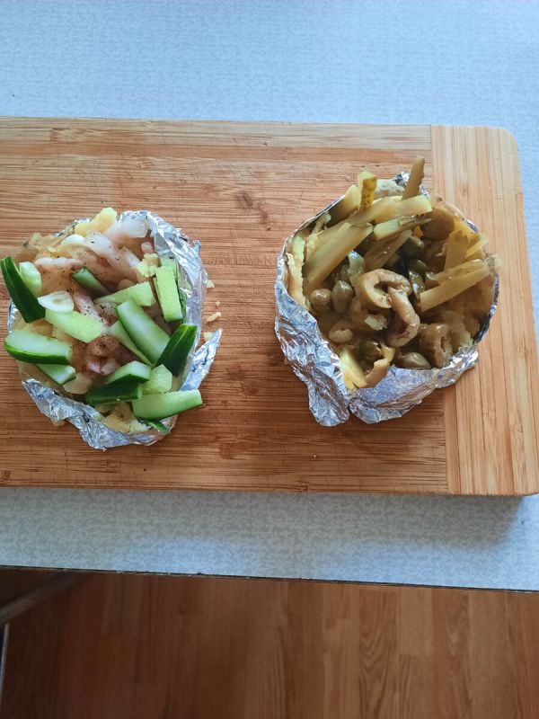 Для первого варианта начинку можно обжарить на сухой сковороде и выложить в картошку, посыпать свежемолотым перцем. Для второго варианта просто выложить оливки и каперсы. Начинка может быть любой — экспериментируйте по своему вкусу!