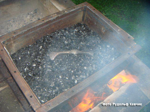 Важным этапом работы является интерактивный процесс, в котором предмет периодически погружается в уголь, переворачивается и снова погружается. Это позволяет равномерно прогреть поверхность. Как только достигается желаемый цвет оксидной плёнки, изделие извлекается из реактора и помещается в масло на короткое время. Затем излишки масла удаляются с помощью пламени, что придаёт продукту окончательный штрих. Для этого используются различные масла — от художественного льняного до моторного, в зависимости от типа изделия.