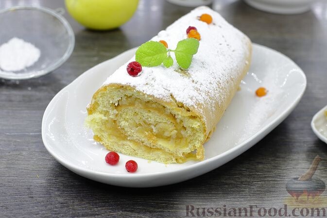 - Бисквитный рулет с яблоками: Воздушный бисквит с кисло-сладкой наполнен яблоками, создаёт удивительное сочетание вкусов, напоминающее традиционную шарлотку.