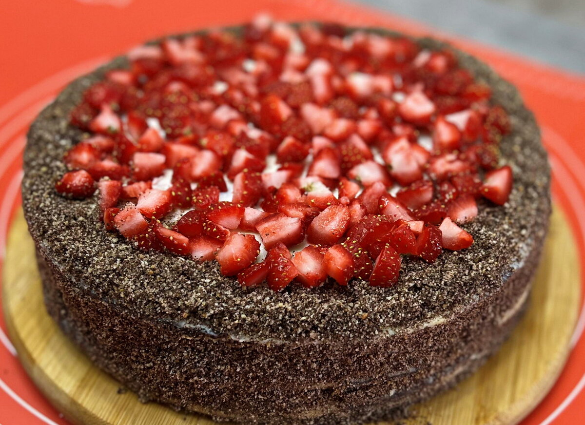 После выпекания коржи остывают, затем собирается торт, смазывая каждый корж кремом, приготавливаемым из творога и сгущенного молока в пропорции 1:1. Торт можно украсить крошкой и нарезанной клубникой. Дадим ему пропитаться и подаем к чаю — ваш маленький шедевр готов!