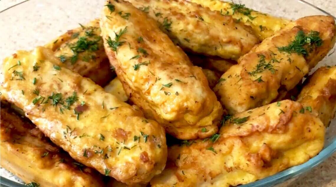 После формирования пальчиков, обваляйте их в муке и поместите в морозильник на 15 минут. В это время приступайте к приготовлению кляра: взбейте яйца с лимонным соком, добавьте специи и немного воды. Постепенно вводите муку и разрыхлитель, тщательно перемешивая.