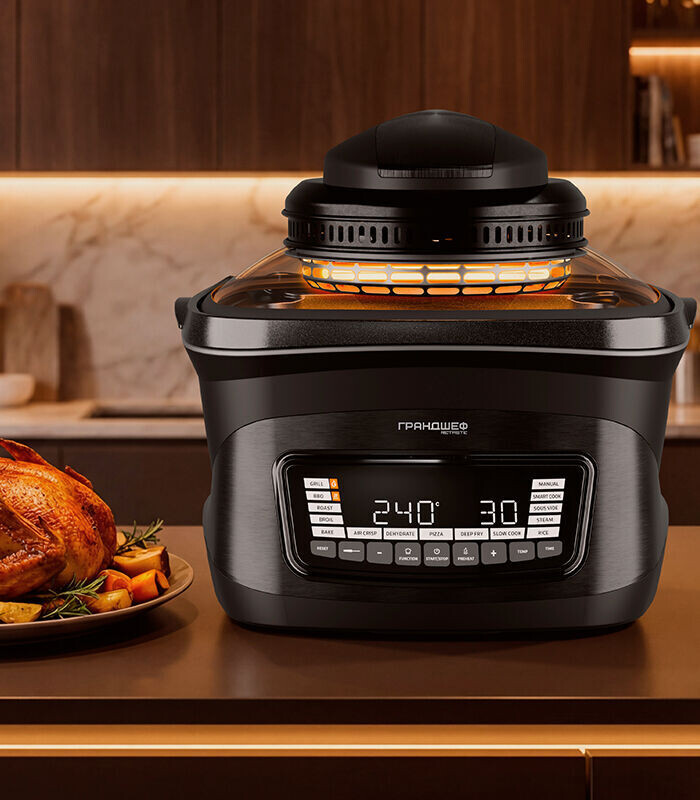 Это устройство стало настоящей звёздочкой среди кухонной техники. Грандшеф объединяет в себе функции аэрогриля, пароварки, мультиварки, фритюрницы и ещё множество полезных функций. С его помощью удастся не только сэкономить пространство на кухне, но и существенно ускорить процессы приготовления. Мощная 8-литровая чаша позволяет готовить большие порции, а разнообразные аксессуары в комплекте делают его универсальным решением для новогоднего меню.