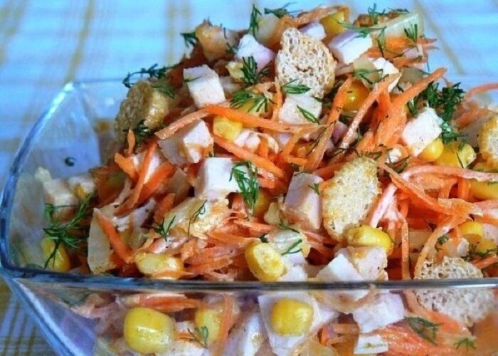 После этого заправить получившуюся массу майонезом. Для оригинальности можно подать салат в тарталетках, а перед подачей посыпать сухариками. Важно делать это в самом конце, чтобы они не размокли и сохранили хрустящую текстуру.