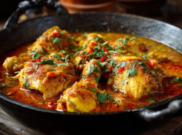 Приготовление соуса: В той же сковороде обжаривается лук до мягкости, затем добавляется томатная паста. После этого добавляются нарезанные помидоры и специи. К луку возвращают курицу, заливают бульоном и тушат под крышкой на медленном огне 25-35 минут. За 10 минут до готовности добавляют чеснок.