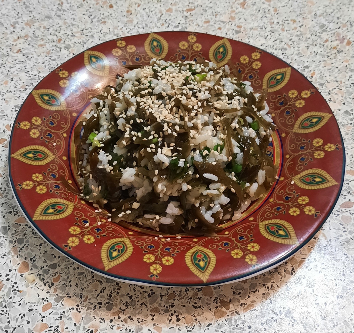 В глубоком салатнике объедините остывший рис, морскую капусту и луковую заправку. Все ингредиенты следует хорошо перемешать, чтобы они наполнились ароматом.