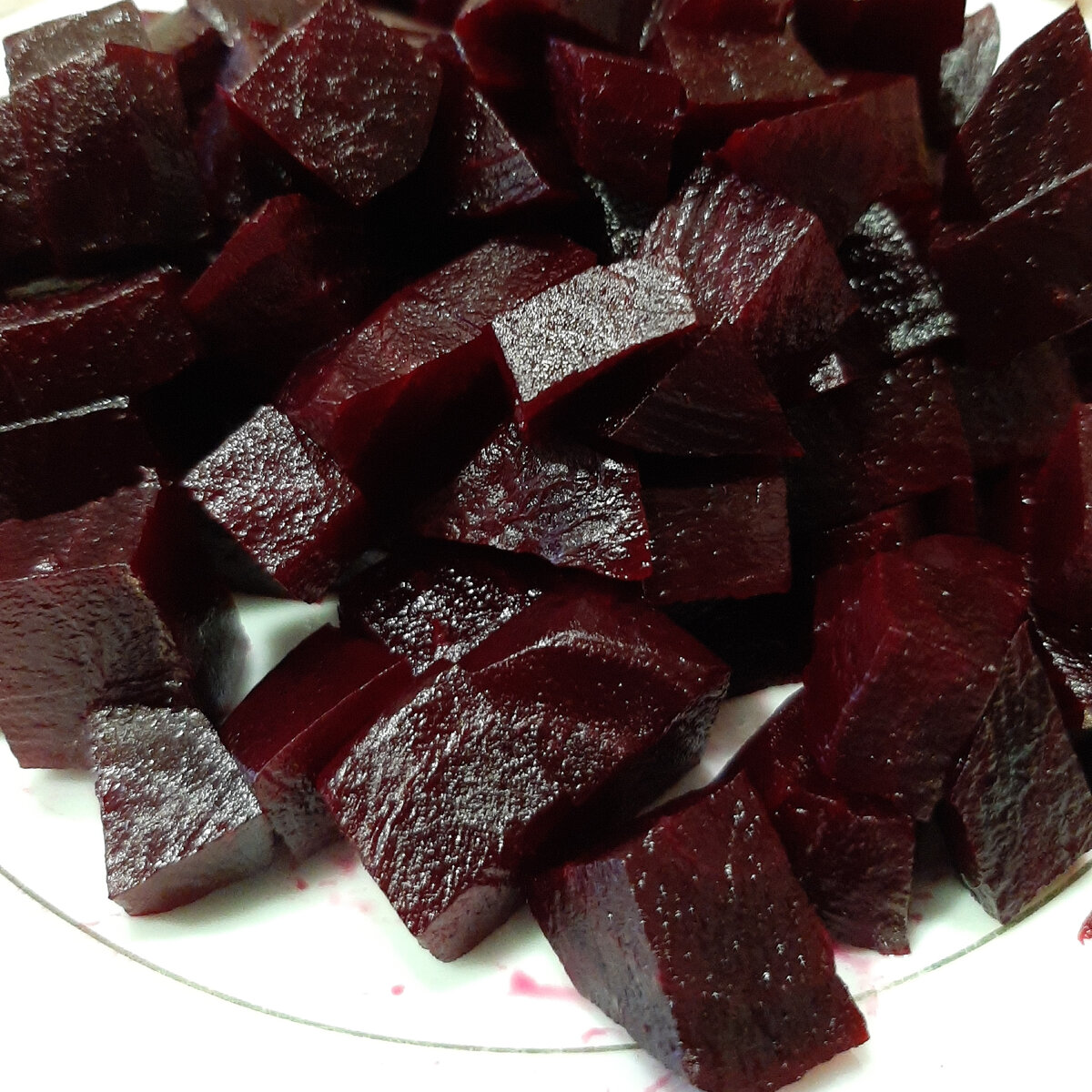1. Свёклу запекать или варить до готовности, затем остудить и нарезать кубиками. Выложить на салатное блюдо.