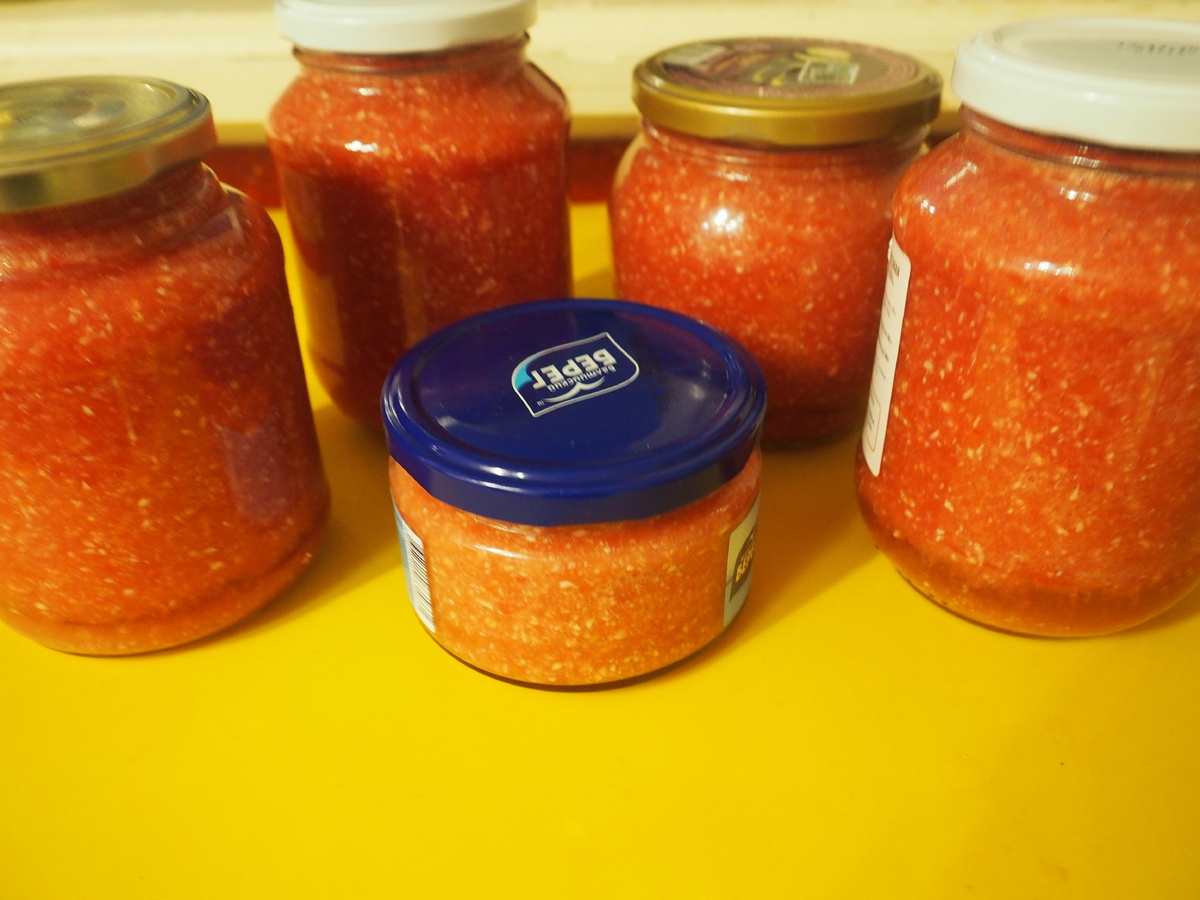 Готовая масса перемешивается с солью и сахаром и пробуется на вкус. Если необходимо, можно чуть подкорректировать пропорции, добавив больше соли или сахара. Переведите аджику в стерилизованные банки и храните в холодильнике. Она готова порадовать своим вкусом после суток настаивания.