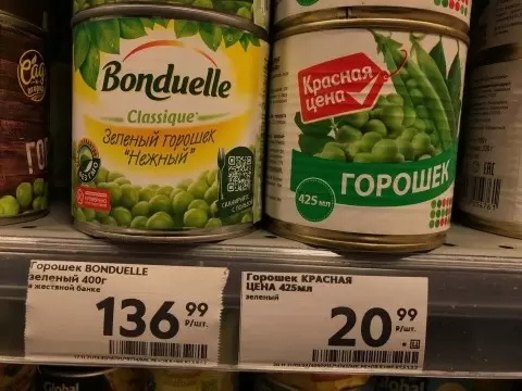 Чтобы разобраться, были оценены два продукта; первый — бюджетный вариант от магазина «Пятерочка» под маркой «Красная цена», стоимостью 20 рублей 99 копеек, и второй — более дорогой горошек от известного бренда «Бондюэль», цена которого составляет 136 рублей 99 копеек. Обе банки имеют одинаковый объем — 425 граммов. Итак, посмотрим, что скрывает упаковка.