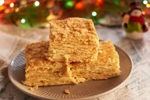 Собирать торт «Наполеон» следует незадолго до подачи на стол — так он останется хрустящим. Не откладывайте наслаждение этим великолепием — с новой текстурой и отменным вкусом «Наполеон» может стать главным угощением вашего новогоднего стола!