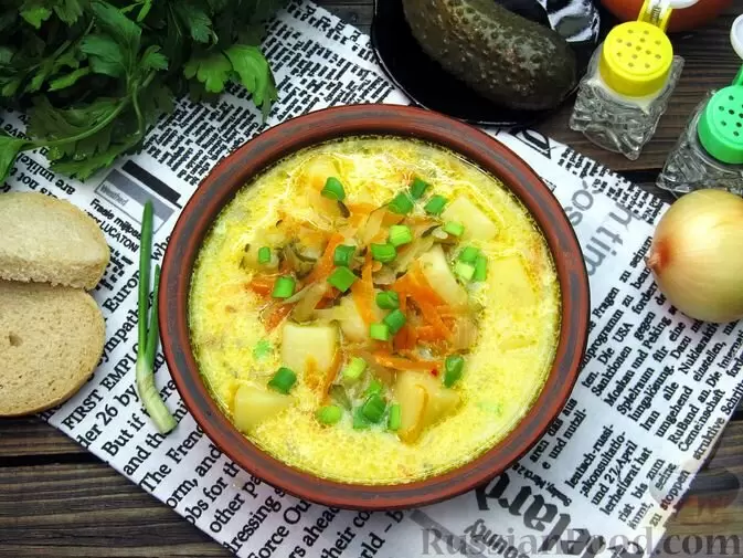 Полезный суп, который готовится на курином бульоне с применением сметаны, удивляет своей консистенцией. Несмотря на отсутствие крупы, он получается достаточно насыщенным и с приятной кислинкой благодаря свежим маринованным огурцам, добавляемым в самом конце.