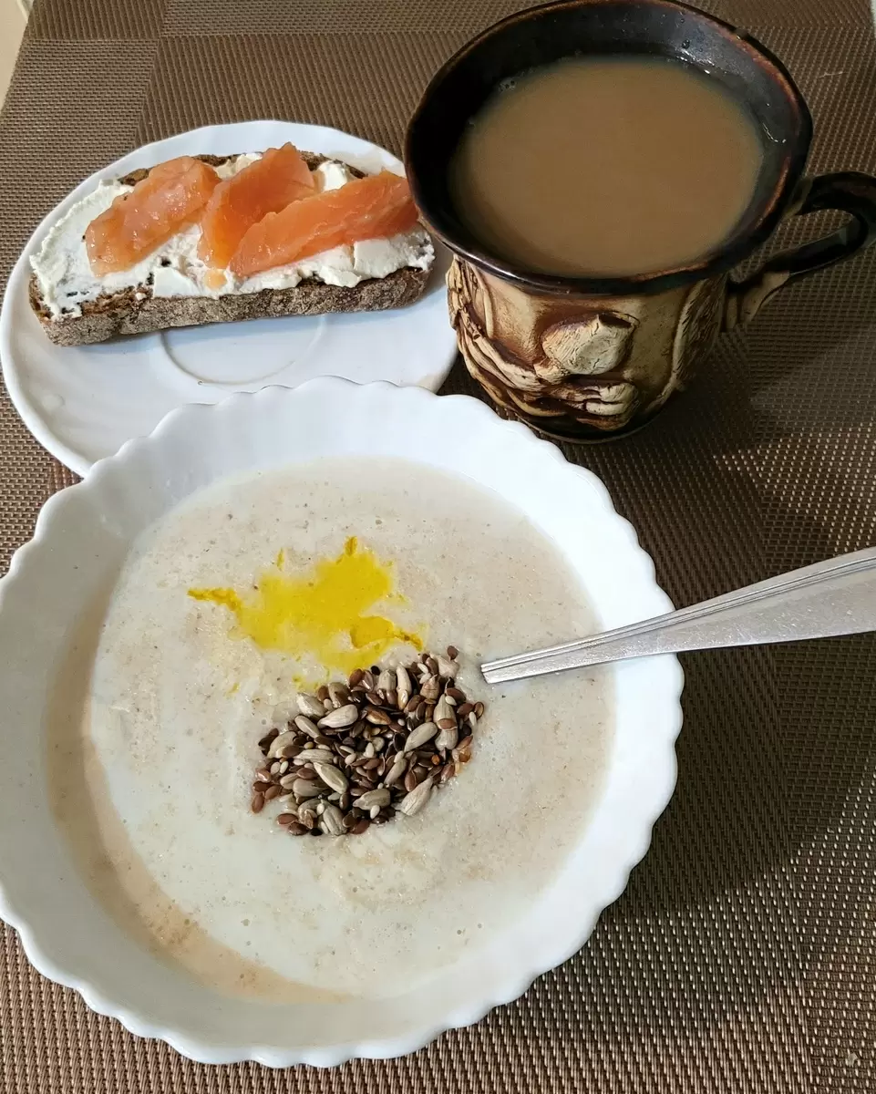 Утро началось с питательной каши из отрубей, которая была дополнена стаканом кофе с молоком и вкусным бутербродом, намазанным рикоттой. Этот сыр стал настоящим открытием — не только дешевле других сортов, но и удивительно вкусным.