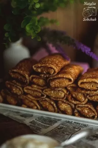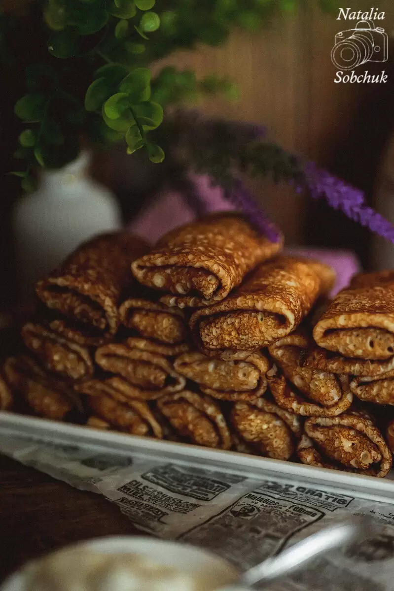 Блинчики следует жарить на сухой сковороде по классической технологии, наполняя каждую порцию начинкой. Эти блины станут отличным дополнением к вашему праздничному столу, порадуют близких и подарят уютные семейные моменты. Приятного аппетита!