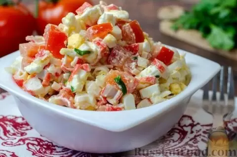 Салат с крабовыми палочками, помидорами, брынзой и яйцами – это сочетание ярких вкусов, которое восхитит даже самых требовательных. Соединение сочного помидора с солоноватой брынзой, деликатными крабовыми палочками и вареными яйцами создает действительно гармоничное блюдо.