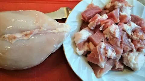 Для приготовления потребуется мясной фарш. Его можно выбрать в магазине или приготовить самостоятельно. В данном случае использовались филе куриной грудки и свиная лопатка, которые были быстро обработаны в блендере вместе с луком и чесноком.