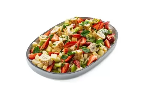 На первый взгляд, кажется, что этот рецепт просто объединяет классические элементы: нежные блины, свежие фрукты, мед и сметану. Однако благодаря оригинальной подаче блюдо превращается в настоящее кулинарное искусство. Блины, смазанные сметаной, закатываются в рулеты, затем нарезаются на диагональные кусочки и добавляются в яркий микс из фруктов. Выбор плодов можно варьировать по вкусу, учитывая собственные предпочтения и возможные аллергические реакции. Комбинация нейтральных яблок и груш, с кисло-сладким акцентом киви и привычной клубникой создает идеальный баланс. А медовая заправка с мятой и лимонной цедрой делает это угощение незабываемым.