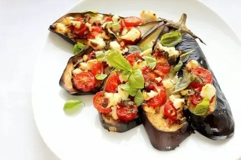 5. Достать противень, раздвинуть пластины баклажанов и равномерно выложить нарезанные помидоры. Посыпать измельченным чесноком и покрошенной фетой. Полить оливковым маслом и добавить свежий базилик.