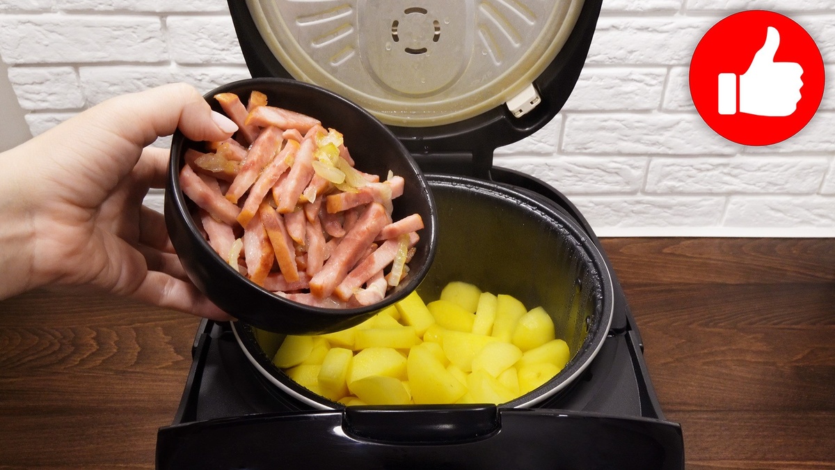 1. Включите мультиварку и установите режим "жарка". В разогретом масле обжарьте крупно нарезанный лук в течение 6 минут. После этого добавьте ветчину, нарезанную ломтиками, и жарьте еще 1–2 минуты.