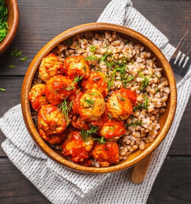 Гречка с томатным соусом и куриными фрикадельками — это не только сытное, но и очень вкусное блюдо, которое точно оценят как взрослые, так и дети.