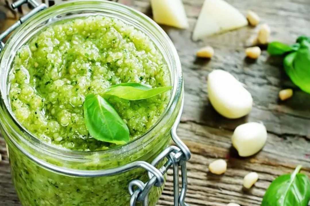 - Постный зелёный песто: содержит свежую или замороженную зелень, орехи, чеснок, воду, соль с перцем. Элементы смешиваются в блендере, готовя изысканный соус.