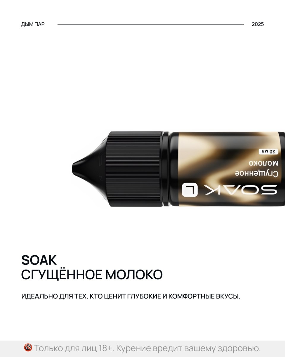 Стоит ли попробовать этот необычный вкус? Однозначно! SOAK «СГУЩЁННОЕ МОЛОКО» сможет удивить даже самых искушенных ценителей сладостей. Не упустите возможность вернуть в свою жизнь те беззаботные моменты, воспользовавшись новой премиальной жидкостью от SOAK. И помните: только для лиц старше 18 лет. Курение вредит вашему здоровью.
