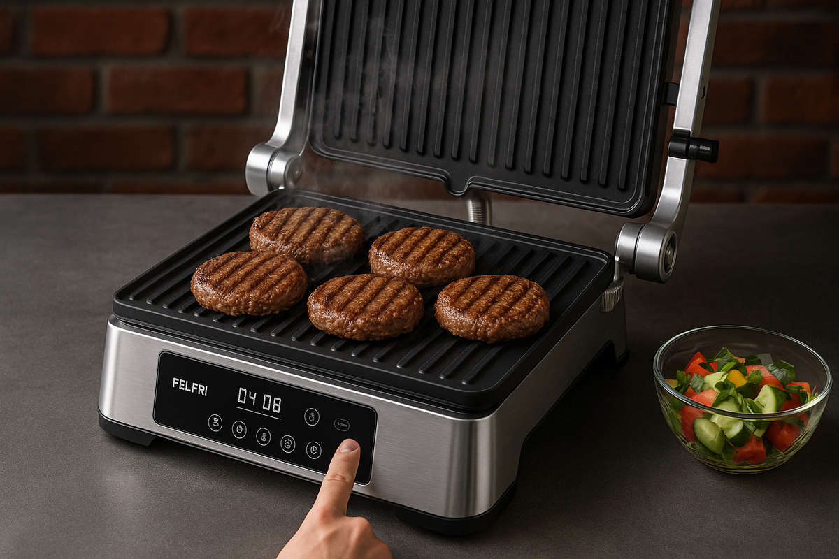 Современные электрогрили, такие как FELFRI, позволяют не только готовить различные блюда, но и сокращают время на уборку. Мощность в 2500 Вт, сменные панели и множество программ — все это обеспечивает равномерное приготовление и легкость в использовании.