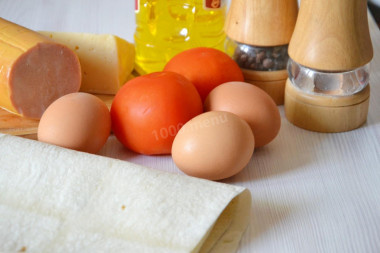 После этого тонкий лаваш разрезается на полоски шириной около 10 см. На каждую из полосок выкладывается начинка: кусочек колбасы, помидор и сыра. Чтобы сформировать треугольники, нужно начать загибать края полоски, чтобы начинка оставалась внутри, чередуя сгибания в разные стороны до полного завершения полоски.