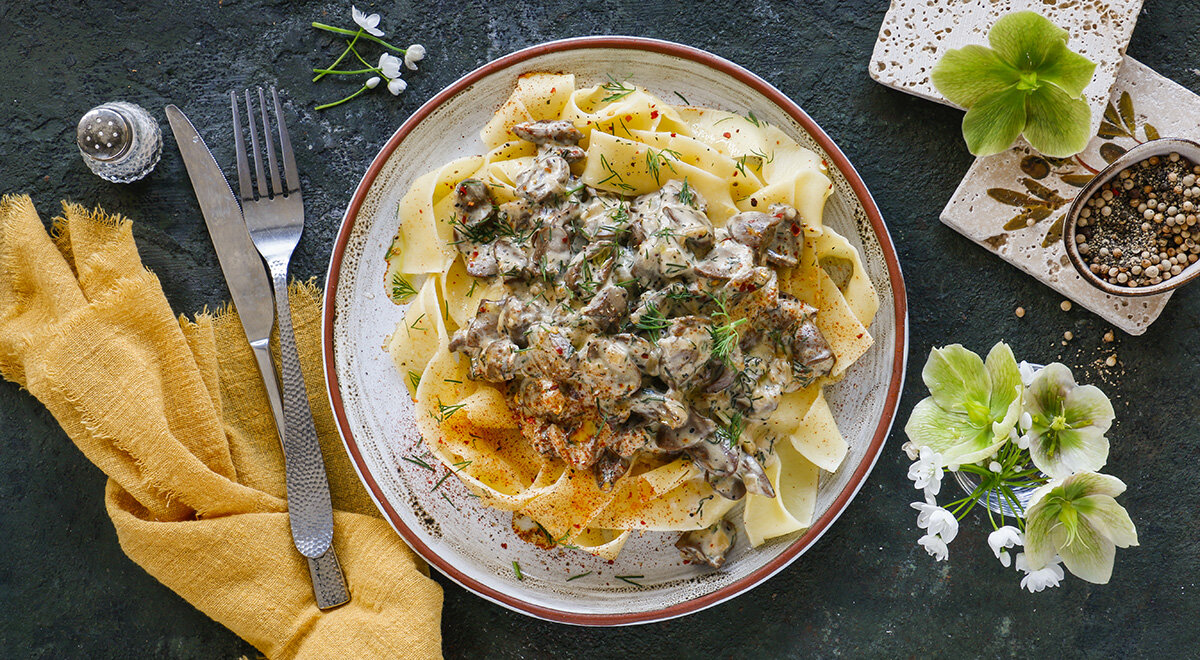 Шаг 3: Добавьте в сковороду сметану. Тщательно перемешайте и тушите без крышки около 10 минут на среднем огне. Подавайте оживленно с вашим любимым гарниром!
