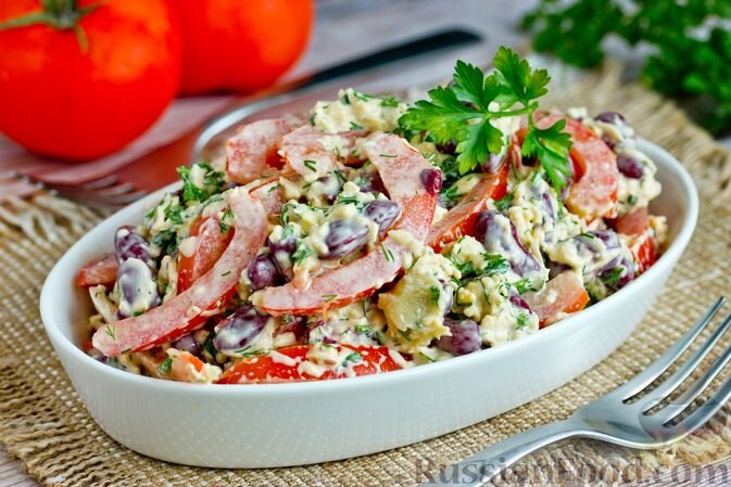 - Фасолевый салат с помидорами и сыром. Готовится за считанные минуты и исчезает с тарелок мгновенно! Этот салат привлекает богатством вкусов и ароматов, а чеснок добавляет особую пикантность.