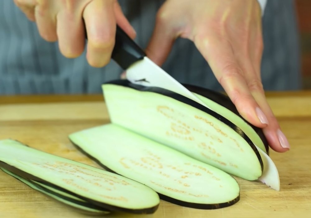 Баклажаны очищают и нарезают вдоль на пластины толщиной 5-6 мм. Каждую пластину солят, смазывают маслом и оставляют на 30 минут, чтобы при жарке они впитали меньше масла.