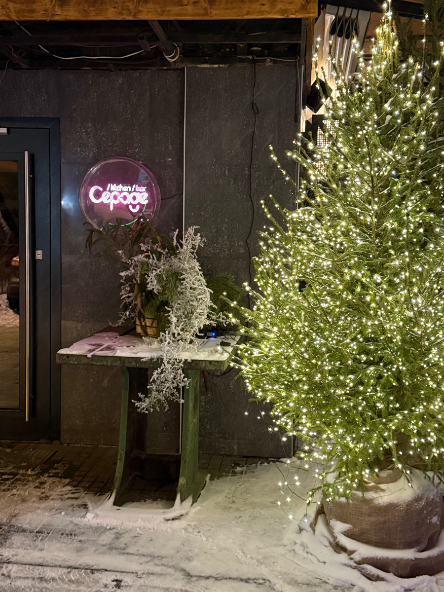 При входе гостей встречает эффектная елка, собранная из винных бутылок, словно намекающая на богатство винной карты заведения. Внутренний интерьер активно вдохновлен темой вина: одна стена полностью отведена под уютную винную коллекцию, а стеклянные витрины с пустыми бутылками создают оригинальную гармонию.