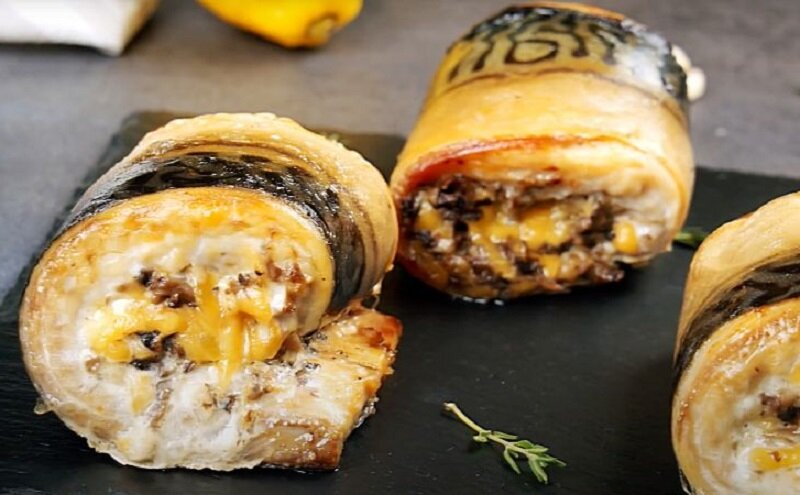 Филе скумбрии наполняйте грибной начинкой, затем сверните в рулеты, начиная с хвоста. Уложите рулеты в форму для запекания швом вниз, предварительно выстелив форму пергаментом и смазав его оливковым маслом.