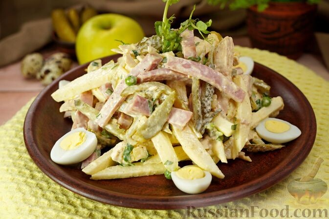 Этот чешский салат с копчёной ветчиной и куриным филе заставит ваши вкусовые рецепторы заиграть новыми красками. В нем гармонично сочетаются маринованные огурцы, отварной картофель, сладкие яблоки и зелёный горошек, что придаёт блюду легкость и свежесть. Нарезка овощей соломкой не только добавляет эстетики, но и делает салат более интересным. Перепелиные яйца служат отличным украшением готового блюда.