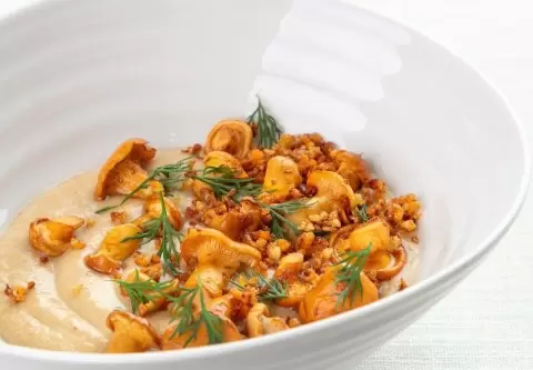 Лисички в картофельном креме — это не просто блюдо, а настоящая кулинарная симфония, созданная по принципу, любимому персонажем Джеймса Бонда: «взболтать, но не смешивать». Отваренный картофель тщательно разминется и превращается в шелковистый крем, который, благодаря мясному бульону и сливкам, приобретает изысканный вкус. Лисички, обжаренные до золотистой корочки, изящно располагаются сверху, напоминая воздушный попкорн. Эта подача вызывает кондитерские ассоциации, но свежий укроп вносит свой корректирующий штрих, придавая блюду точность и завершенность. Рецепт стал доступен благодаря сервису доставки Gallery to Go.