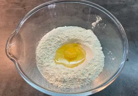 - Добавьте яйцо и растительное масло, слегка перемешайте. После этого переложите муку к жидким ингредиентам, используя вилку для перемешивания.