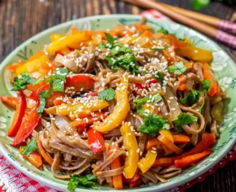 Гречневая лапша с болгарским перцем готова! Подавайте горячей, посыпав свежей зеленью и семенами кунжута для финального акцента.