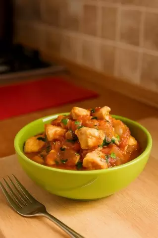 Для начала курицу нарезать на кусочки, приправить солью и специями, а затем оставить мариноваться на полчаса. Обжарить на сковороде до золотистой корочки и тушить в сотейнике с овощами, добавляя томатную пасту и майонез. В финале посыпать свежей зеленью.
