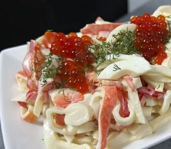 Салат «Коралловый риф» готов. Его можно смело подавать на стол и наслаждаться удивительным вкусом вместе с близкими!