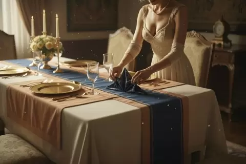 Салфетки подтверждают уважение к гостям: они складываются различными способами, включая классический вариант или более сложные фигуры, такие как лотос. Это добавляет индивидуальности каждому ужину и создает атмосферу праздника.