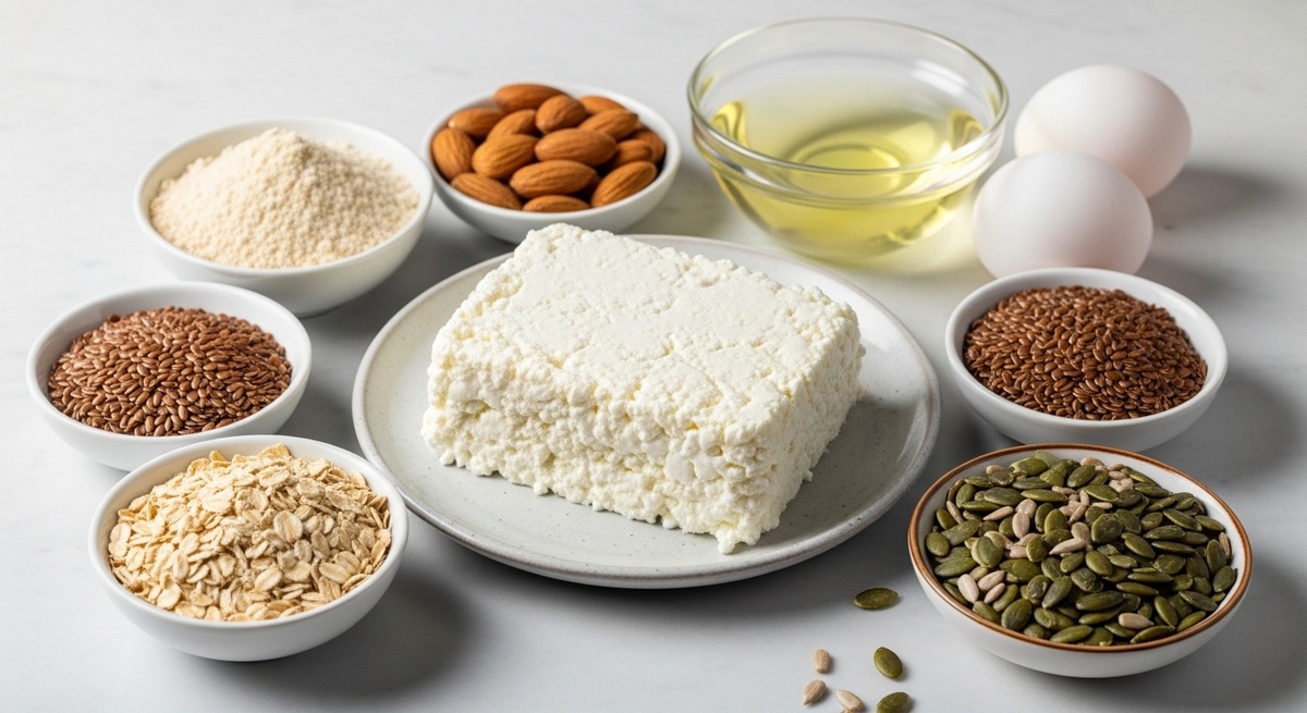 В глубокой миске следует объединить все сухие компоненты: измельченные орехи и семена, цельнозерновую муку и разрыхлитель. Затем добавляют творог и белки. Если творог слишком крупнозернистый, можно взбить его блендером вместе с белками, чтобы добиться более однородной текстуры и нежности хлеба.